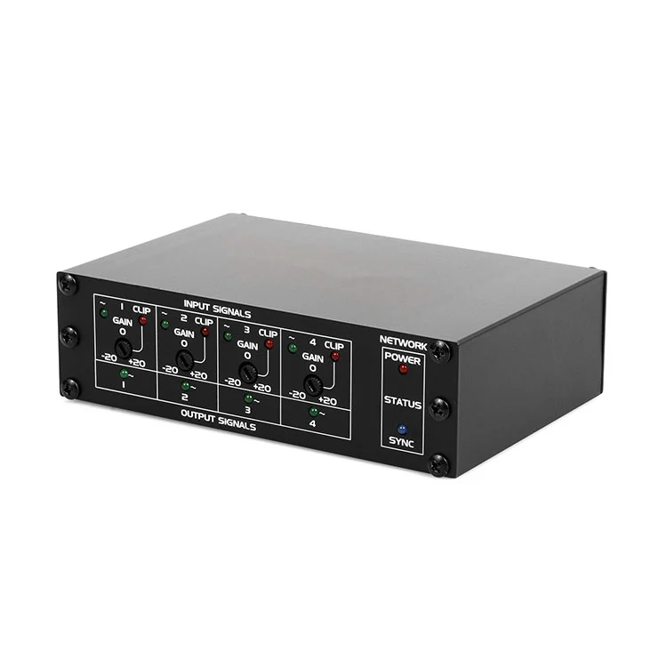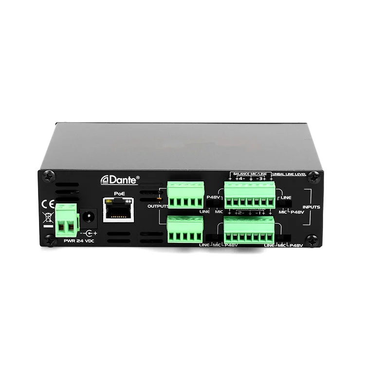 4 MIC- og linjeinngangene Dante -grensesnittet er et profesjonelt lydgrensesnitt basert på Dante Network Protocol, som støtter 4 mikrofon/linjeinnganger og 4 utganger. Den viktigste fordelen er å overføre lydsignaler med lav latens, gjennom IP-nettverk, som er egnet for scenarier som krever fleksible ledninger, fjernoverføring eller flerkanals lydintegrasjon. Det er egnet for live lyd, roadcast/streamingproduksjon, konferansesystem, utdanningssteder er egnet og så videre.